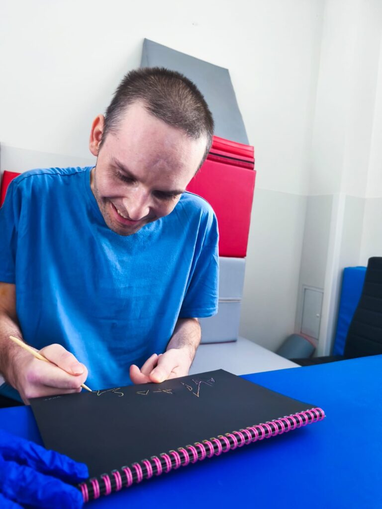 W jego codzienności pojawiły się także nowe aktywności – układanki i malowanie, które wspierają koncentrację i sprawiają mu radość.