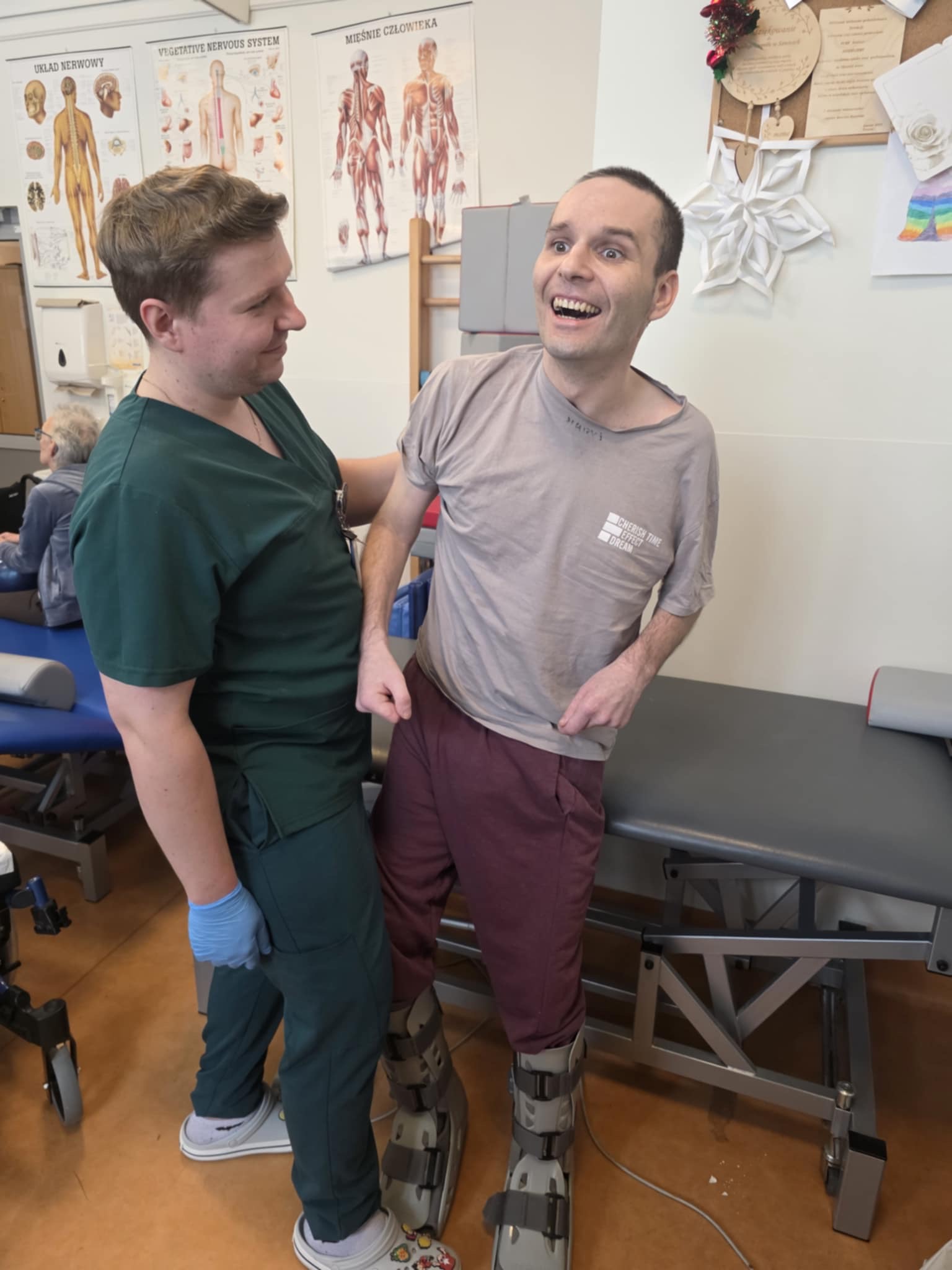 Dziś ponownie nawiązuje kontakt z otoczeniem i komunikuje swoje potrzeby. Stopniowo odzyskuje samodzielność – samodzielnie je, ćwiczy wstawanie oraz chodzi z pomocą balkonika i terapeutów